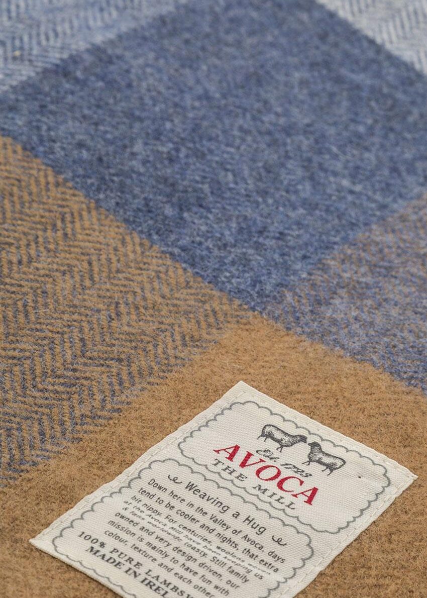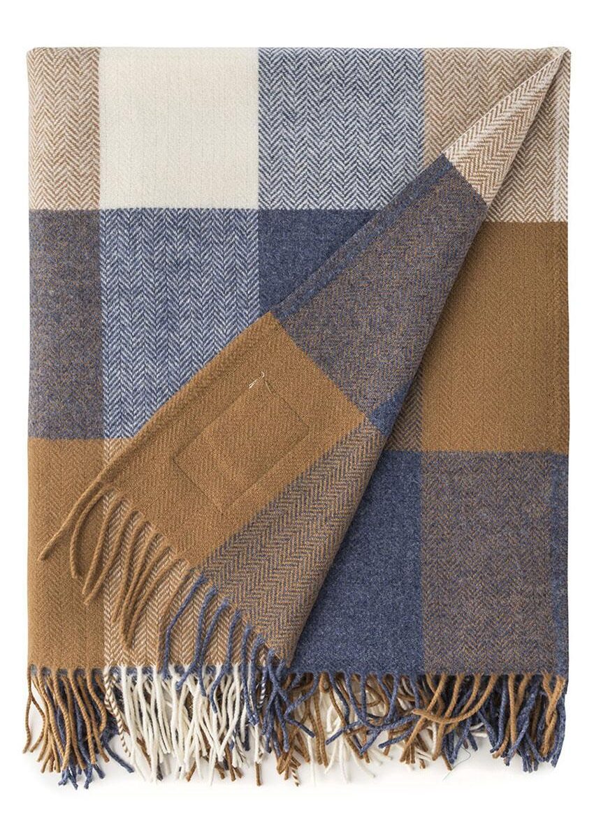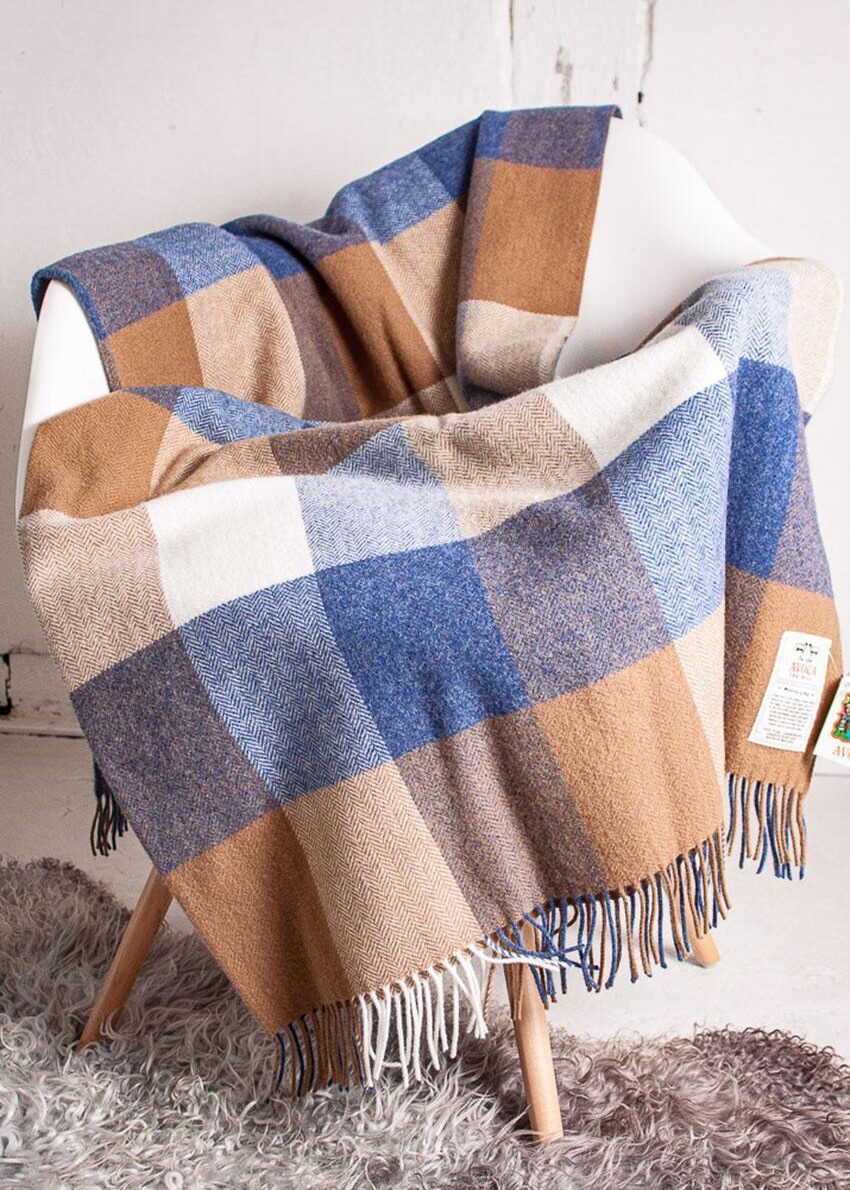 Eine leichte Lambswooldecke kombiniert das klassische Fischgrätmuster und große Karos. Made in Ireland.